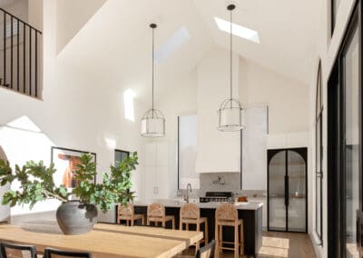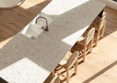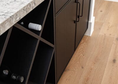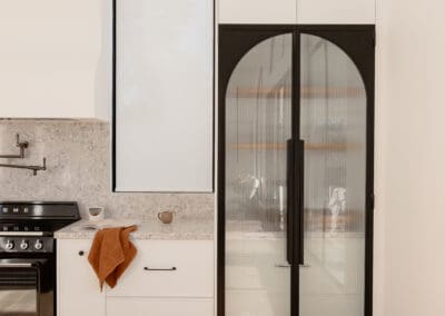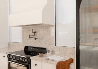Our team designed, manufactured, and installed this kitchen using a Sussex door profile in Dulux Lexicon Quarter for the cabinetry, paired with a striking black island in zero-gloss timber-look Farmers doors. The benchtops in polished Pietra Silestone bring a smooth, textural elegance, while the fluted glass pantry doors with steel framing offer a contemporary architectural gesture.