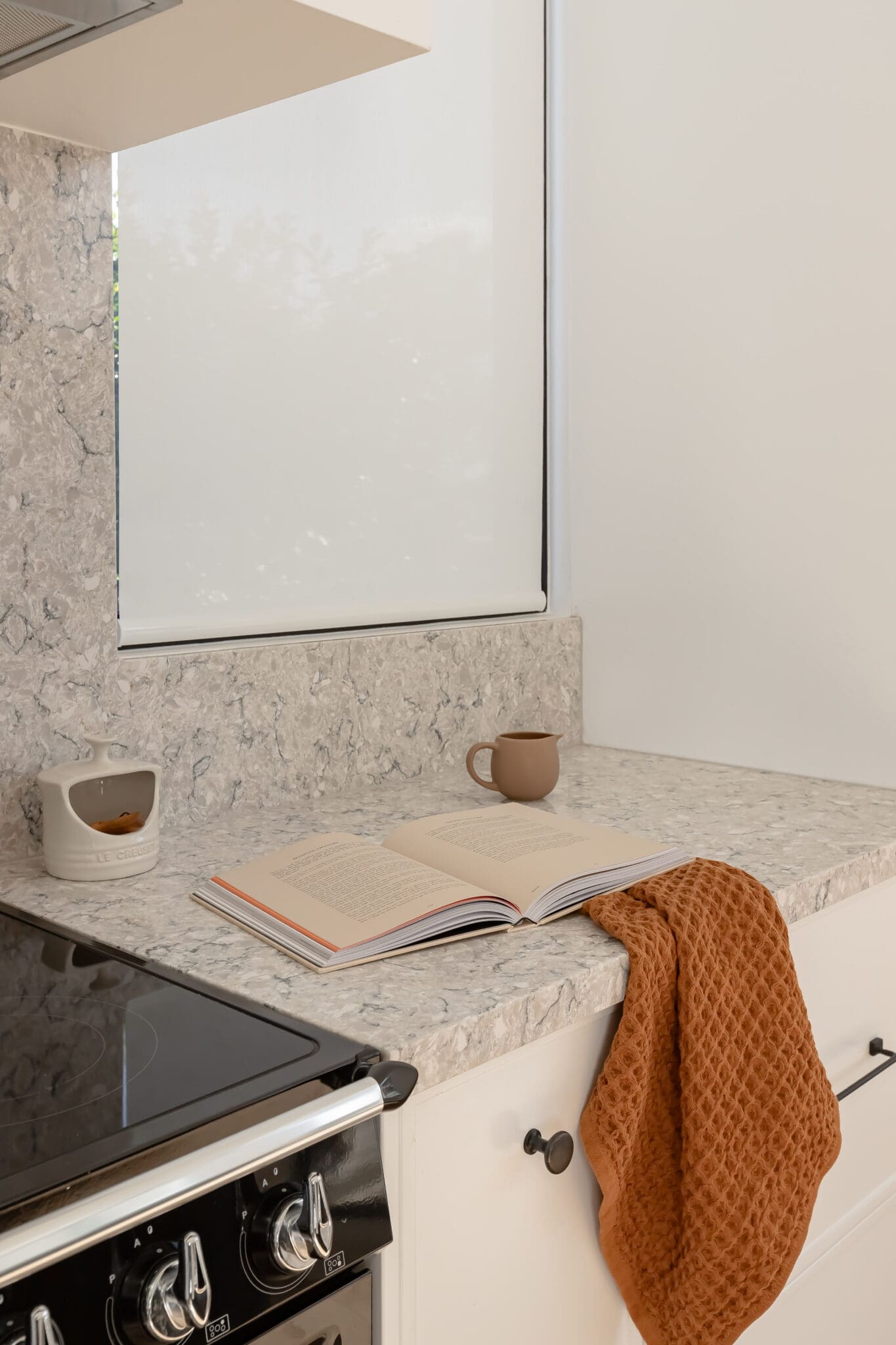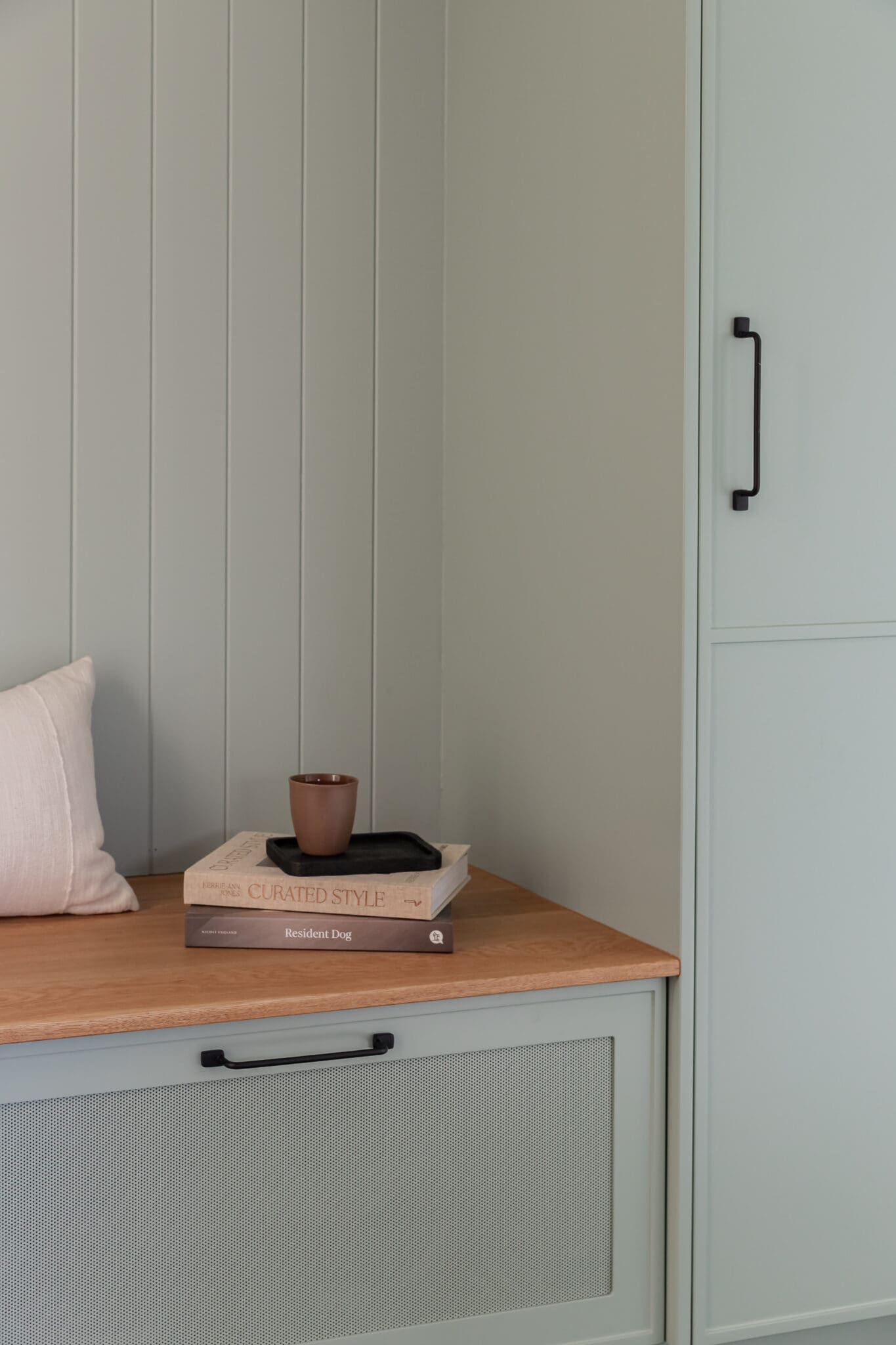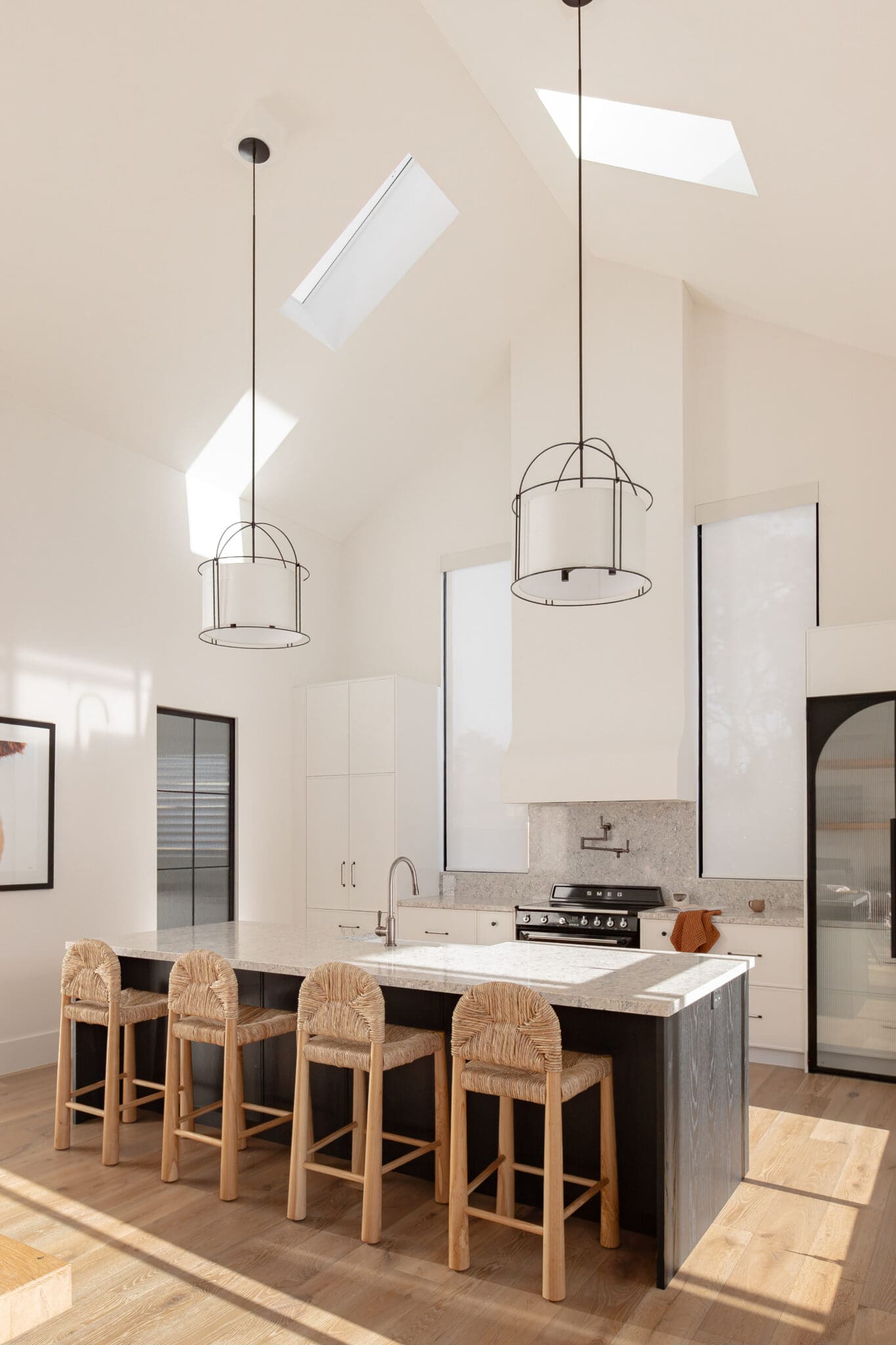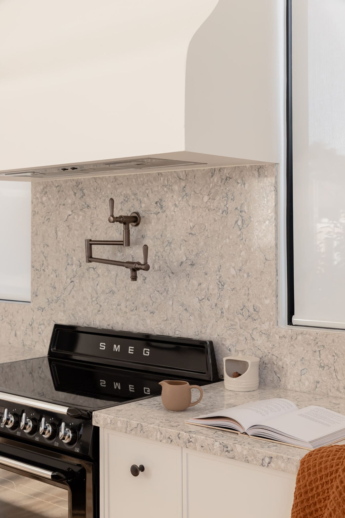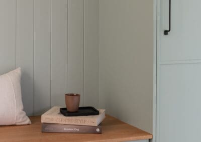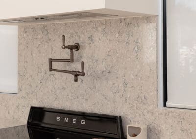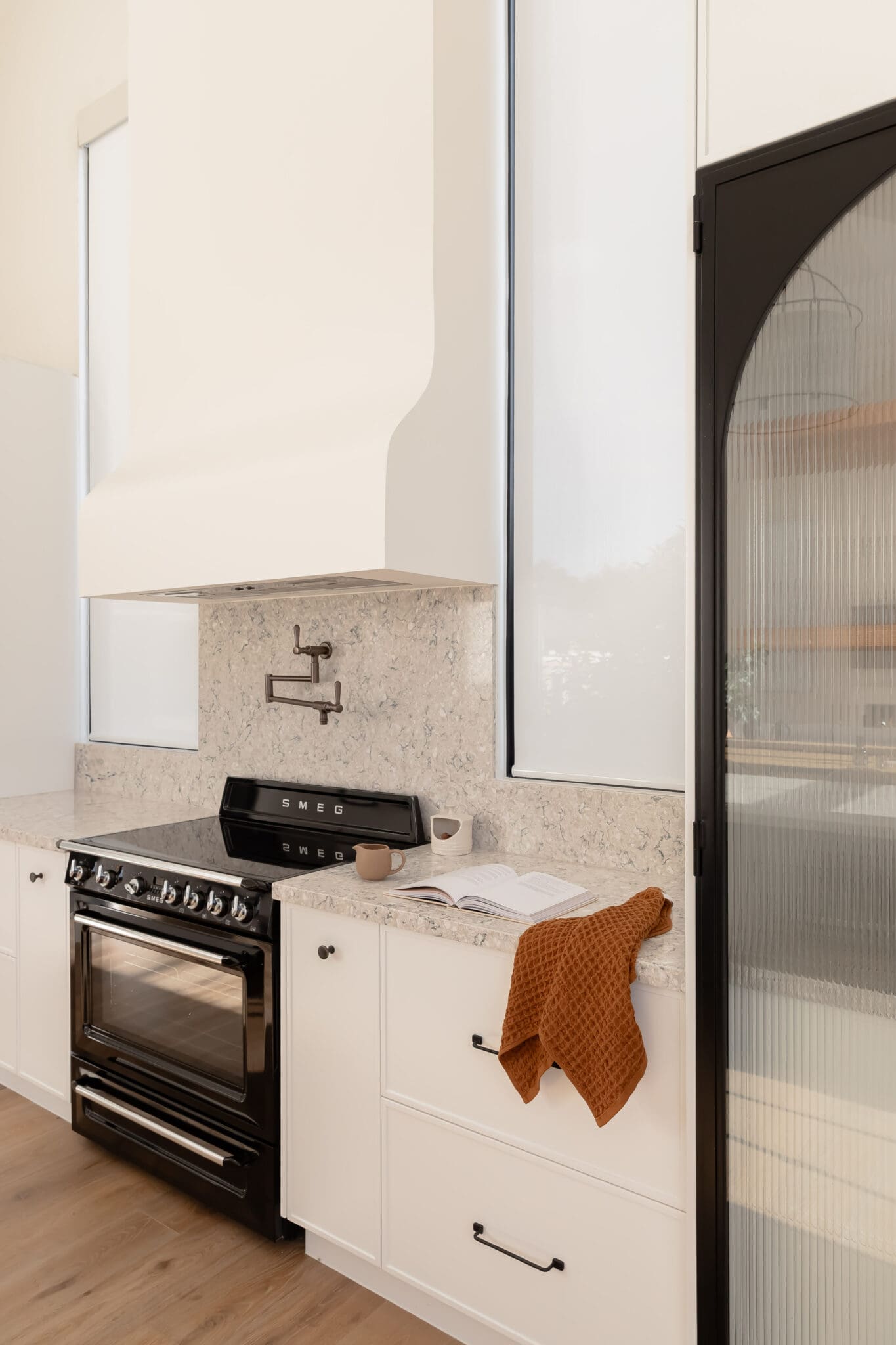 Every surface balances beauty with function. Satin finishes reflect the sunlight softly throughout the day, while Scorched Black and Blackest Black hardware from Hepburn Handles introduce tonal depth without disruption. Appliances from Smeg, PITT, Miele, and Bosch are fully integrated, reinforcing the kitchen’s sleek presence.