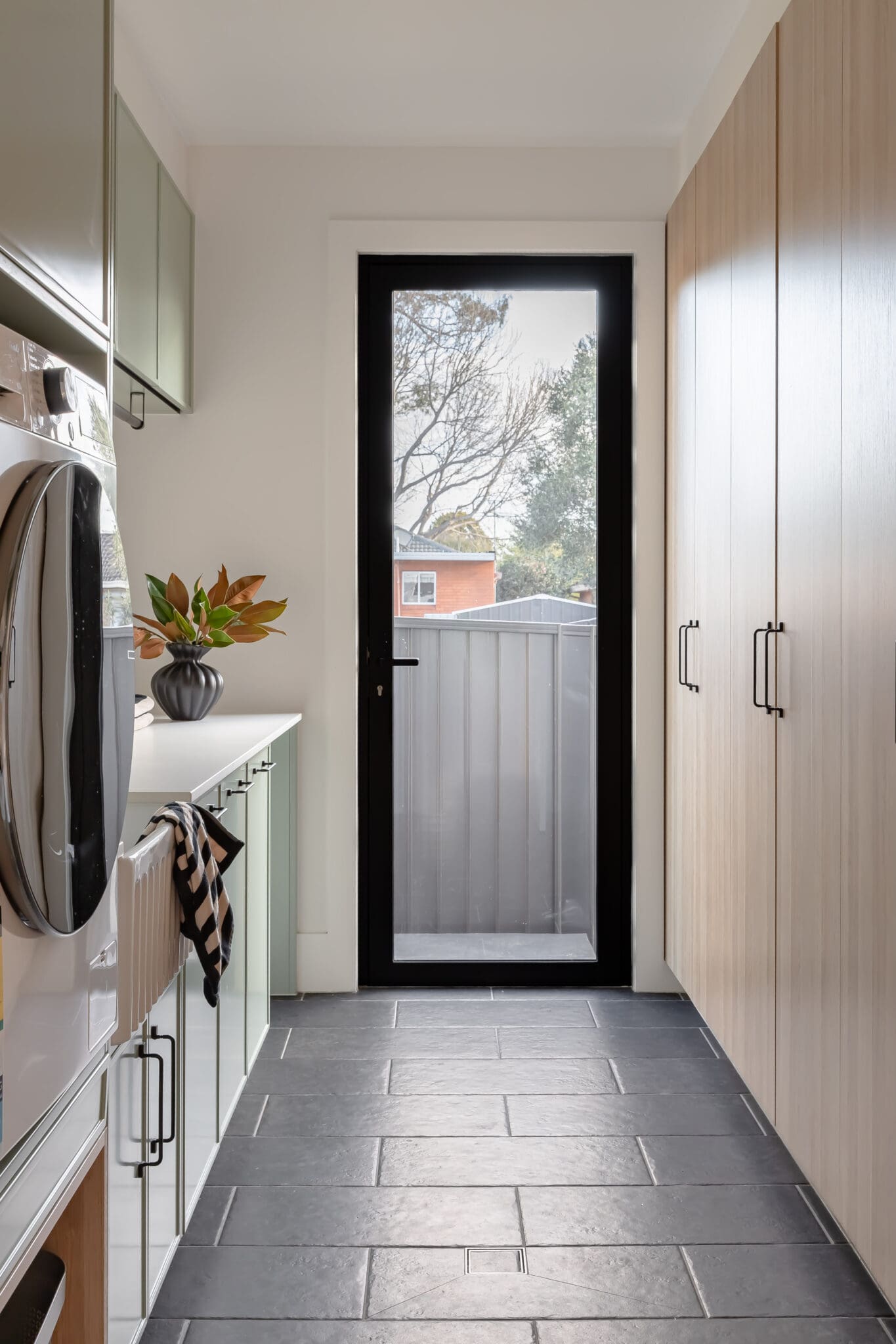 In the laundry and mudroom, a fresh Grass Sands palette meets warm Polytec timber tones. Smartstone Bianco Puro benchtops and storage zones bring practical performance to everyday.